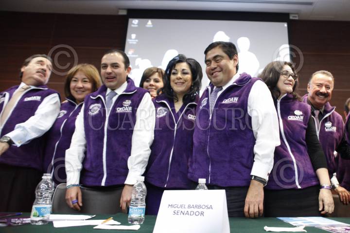 MÉXICO, D.F., 22NOVIEMBRE2012.- Los senadores Angélica de la Peña, Alejandra Barrales, Lorena Cuéllar, Dolores Padierna, Miguel Barbosa, Fidel Demédicis, asistieron a la presentación del lanzamiento de la campaña Soy tú, soy yo, somos todas y todos, con el propósito de conmemorar el Día de la No Violencia contra la Mujer. También asistieron Emilio Gamboa, coordinador de los senadores del PRI, y Ernesto Cordero, presidente de la mesa directiva del Senado. FOTO: CUARTOSCURO.COM