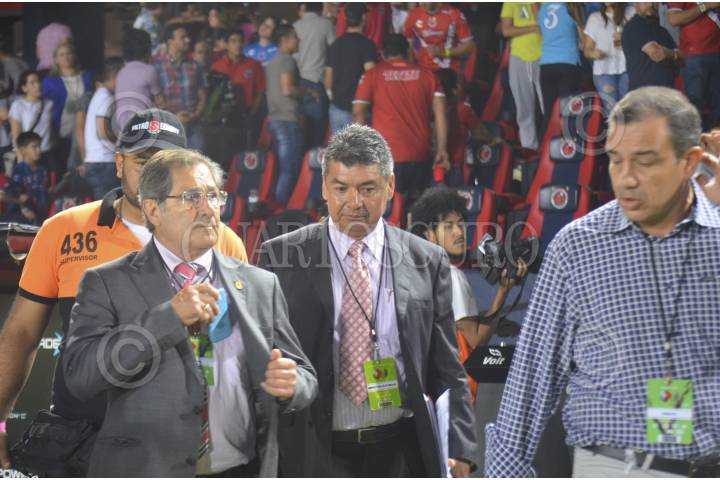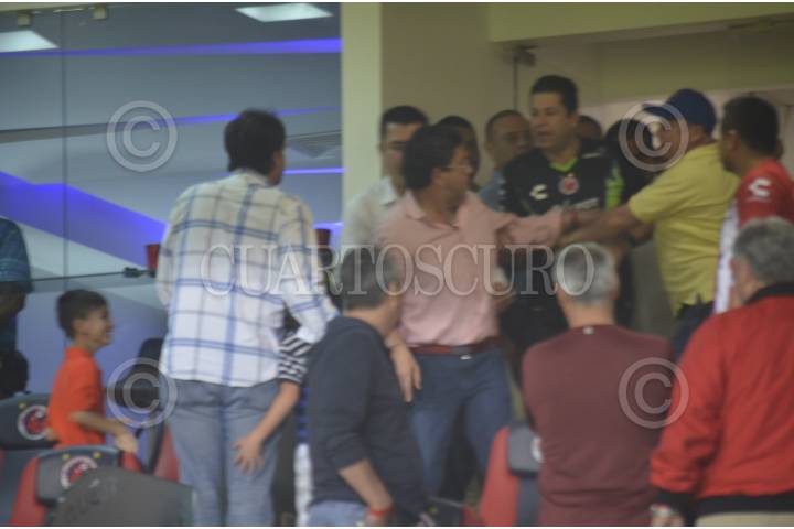 VERACRUZ, VERACRUZ, 15ENERO2016.- orría el minuto 88 del duelo en el Puerto Jarocho cuando Daniel Villalva fue expulsado tras una barrida, situación que causó la molestia de los veracruzanos, pero todo fue más allá de las canchas, ya que Fidel Kuri Grajales, dueño del equipo, se acercó al palco para agredir a Edgardo Codesal, titular de la Comisión de Arbitraje. Kuri se mostró molesto por la roja que vio el "Keko" y encaró a Codesal, quien en su lugar solo escuchó al directivo sin mirarlo a los ojos, algo que causó aún más la molestia al propietario de los Tiburones Rojos, quien primero le dio una palmada en la espalda, lo que provocó que gente de seguridad se hiciera presente. Pero Kuri no fue el único, ya que se acercaron otras dos personas; uno de ellos también le dio un empujón a Codesal, quien tuvo que abandonar el palco escoltado por gente de seguridad, mientras algunos acompañantes de Kuri Grajales intentaban calmar los ánimos. FOTO: ANDREA SANCHEZ/ CUARTOSCURO.COM