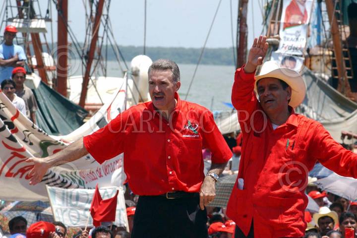 Veracruz, 04 JULIO 2004.- Roberto Madrazo, presidente nacional del PRI y el candidato a la guibernatura del estado de veracruz Fidel Herrara durante la gira en apoyo a los canditados a la alianza fidelidad por Veracruz. FOTO: Juan Flores/CUARTOSCURO.COM