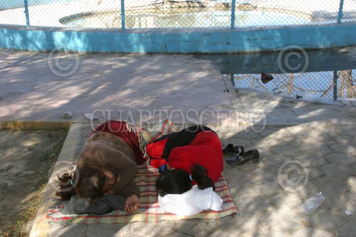 ESPINAZO, MPIO. MINA,N.L.17OCTUBRE.2006.- Cansados tras ir danzando durante la peregrinación, después de dar la vuelta al pirul y recorrer la calle Jerusalén hasta la tumba del Niño Fidencio, un matachín y una misionera rezan ante el altar donde se alzan las figuras del Santo Niño y Jesucristo durante la conmemoración del 108 natalicio de José Fidencio Síntora Constantino. FOTO: PEDRO VALTIERRA/CUARTOSCURO.COM
