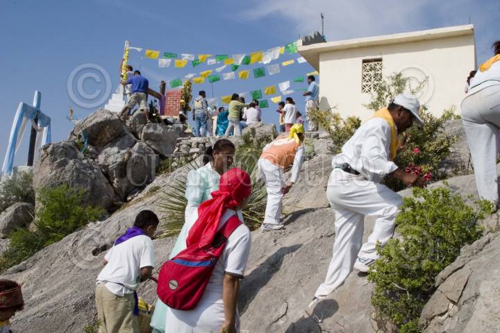 ESPINAZO NL.19MARZO2007.-NIÑO FIDENCIO. Organizados en misiones, provenientes de distintos rincones de la República y de los Estados Unidos, los fidencistas ascienden la empinada ladera del Cerro de la Campana, uno de los sitios sagrados de la Iglesia Fidencista y donde se realizan curaciones, rezos y cantos. FOTO PEDRO VALTIERRA/CUARTOSCURO.COM