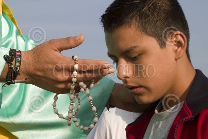 ESPINAZO NL.19MARZO2007.-NIÑO FIDENCIO. Un fiel fidencista recibe la bendición de una ¨materia¨, quien de acuerdo con los ritos fidencistas, es el cuerpo que utiliza el Santo Niño Fidencio para seguir curando en la tierra. Durante la celebración de su santo en el Cerro de la Campana. FOTO PEDRO VALTIERRA/CUARTOSCURO.COM