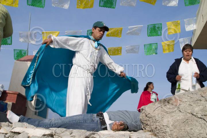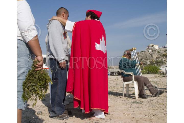 ESPINAZO NL.19MARZO2007.-NIÑO FIDENCIO. Una ¨materia¨ realiza una curación a un peregrino fidencista en lo alto del Cerro de la Campana, uno de los sitios sagrados a visitar durante las fiestas de San José, celebradas en honor del Niño Fidencio. FOTO PEDRO VALTIERRA/CUARTOSCURO.COM