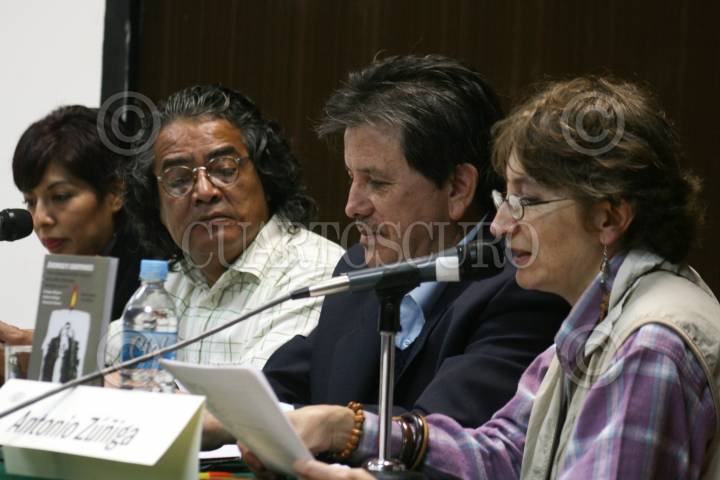 MÉXICO D.F., 21SEPTIEMBRE2008.- Rocío Galicia (compiladora) Pedro Valtierra y José María Valenzuela durante la presentación del libro "Animas y Santones. Vida y milagro del Niño Fidencio, el Tiradito y Malverde", dentro de la Feria del Libro del INAH que se realiza en el Museo de Antropología en Chapultepec. La antología para teatro de los dramaturgos Enrique Mijares, Antonio Zuñiga y Alejandro Román y que cuentan la historia de estos tres personajes, admirados como santos del pueblo y no reconocidos por la iglesia católica fue compilada por Rocío Galicia. El libro editado por Godot y el Centro de Investigación Teatral. FOTO: RICARDO CASTELAN/CUARTOSCURO.COM