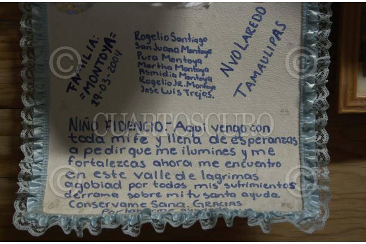 ESPINAZO, NUEVO LEON.18.Sept.2004.-FOTOHISTORIANIÑO FIDENCIO. La carta de una mujer desesperada pegada en la pared junto a otros miles de agradecimientos por los favores recibidos del Niño Fidencio que murió en 1938. Los fines de semana, de todo el país y el extranjero, llegan cientos de seguidores de La Iglesia Fidencista, que está legalmente constituída y es reconocida por la Secretaría de Gobernación. FOTO PEDRO VALTIERRA/CUARTOSCURO.COM