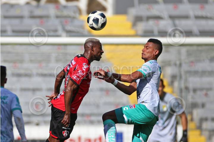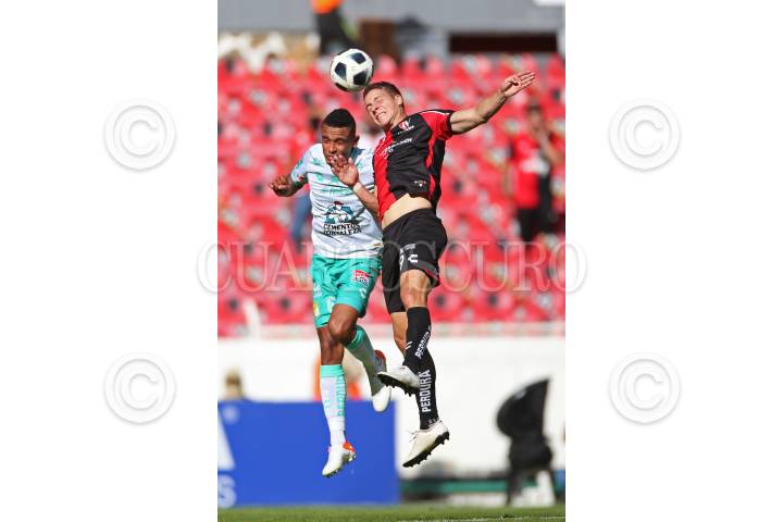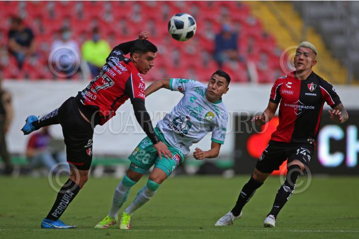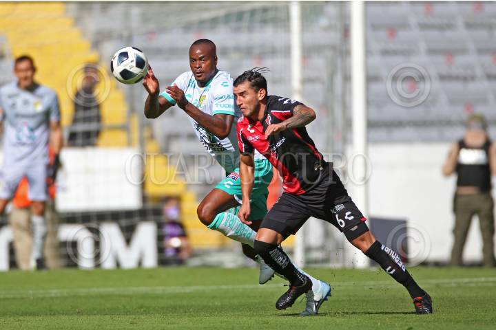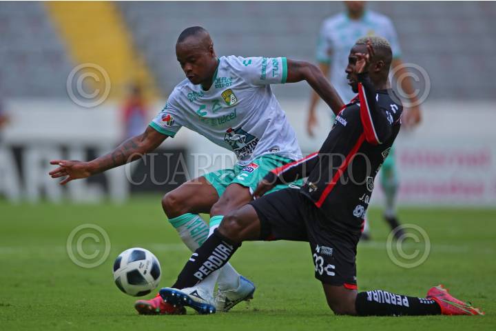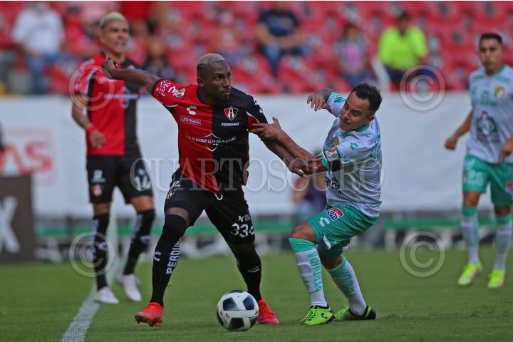Julián Quiñonez jugador de Atlas, disputa un balón frente al contrario de León, William Tesillo, esto durante el juego correspondiente a la fecha 10 del del Torneo Grita México Apertura 2021 de la Liga MX.
