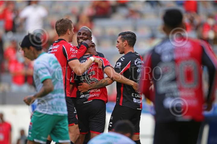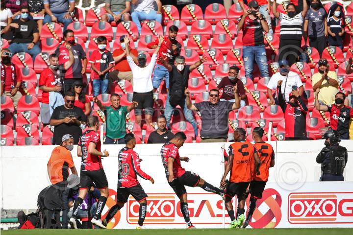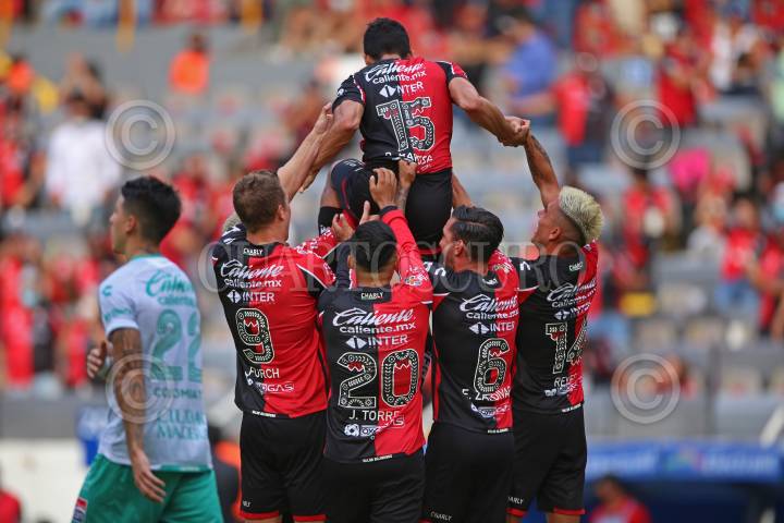 Anderson Santamaría jugador de Atlas celebra su anotación con sus compañeros de equipo, esto durante el juego correspondiente a la fecha 10 del del Torneo Grita México Apertura 2021 de la Liga MX.