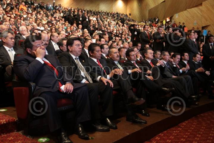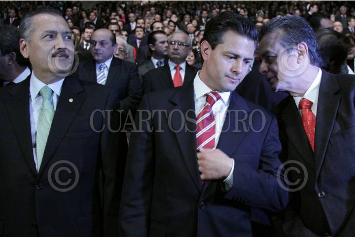 MORELIA, MICHOACÁN, 15FEBRERO2012.- Manlio Fabio Beltrones Rivera, senador del PRI; Enrique Peña Nieto, precandidato del PRI a la presidencia de la República; y Pedro Joaquín Coldwell, presidente nacional del PRI, acudieron a la celebración de toma de posesión como gobernador del Estado de Fausto Vallejo Figueroa. FOTO: IVÁN STEPHENS/CUARTOSCURO.COM