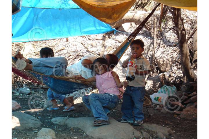 CARRIZALILLO GUERRERO23FEBRERO2007.- Unos nños se divierten en una amaca en el campamento del bloqueo que mantienen ejidatarios de la comunidad de Carrizalillo en la entrada a la mina "Los Filos" de la compañia minera Luismin, desde hace mas de un mes, el cual podria levantarse este sabado al llegar a un arreglo con la empresa. FOTO: OSCAR LAVARADO/CUARTOSCORO.COM