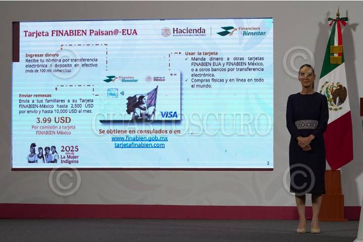 CIUDAD DE MÉXICO, 21 de julio de 2025.– Rocío Mejía Flores, directora de la Financiera para el Bienestar, comentó sobre las tarjetas Finabien, las cuales permiten a los paisanos en Estados Unidos enviar remesas a sus familiares en México, evitando así el cobro de impuestos excesivos por parte de las instituciones bancarias. Esto lo expresó durante la Mañanera del Pueblo. FOTO: MOISÉS PABLO / CUARTOSCURO.COM