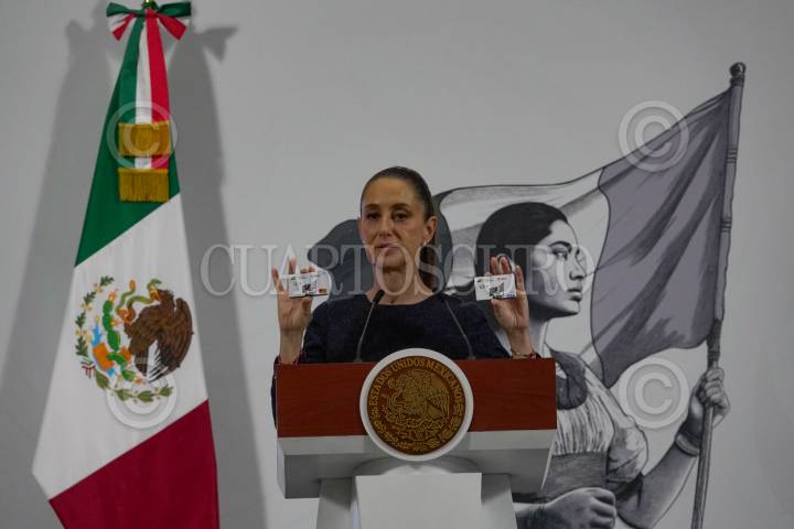 CIUDAD DE MÉXICO, 18JULIO2025.- Claudia Sheinbaum, presidenta de México, durante la Conferencia del Pueblo, mostrando las tarjetas de Financiera Bienestar para el tema de remesas y apoyo a los migrantes en Estados Unidos. FOTO: ROGELIO MORALES /CUARTOSCURO.COM