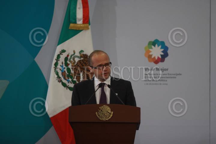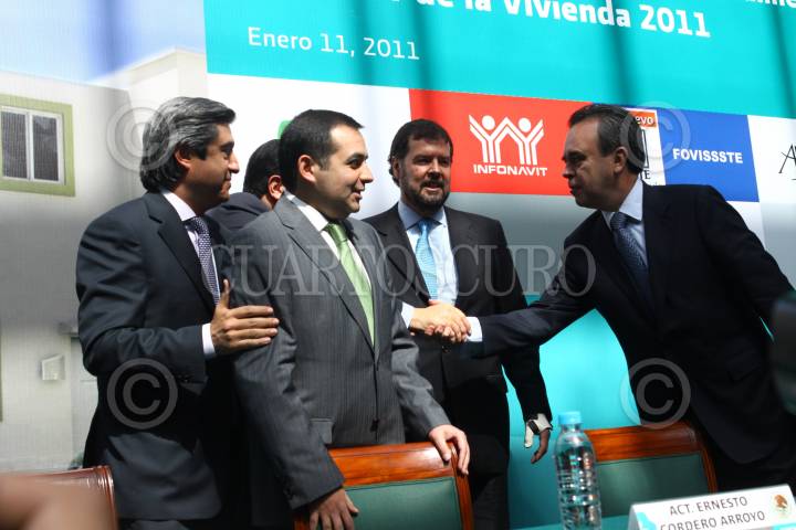 MÉXICO, D.F., 11ENERO2011.- Ignacio Deschamps, presidente de la Asociación de Bancos de México, Ernesto Cordero, Secretario de Hacienda, Javier Gavito Mohar, director de la Sociedad Hipotecaria Federal y Victor Manuel Borras, director del INFONAVIT, durante la presentación de los "Programas y acciones de financiamiento al sector de la vivienda 2011" en el museo del Arzobispado. FOTO: MOISÉS PABLO/CUARTOSCURO.COM