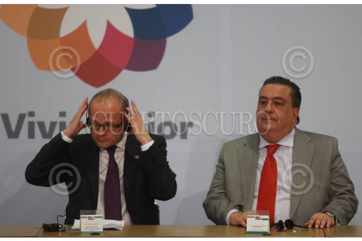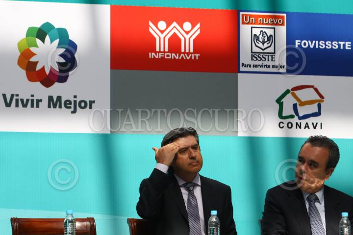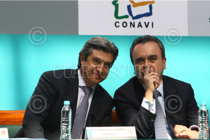 MÉXICO, D.F., 11ENERO2011.- Ignacio Deschamps, presidente de la Asociación de Bancos de México y Victor Manuel Borras, director del INFONAVIT, durante la presentación de los "Programas y acciones de financiamiento al sector de la vivienda 2011" en el museo del Arzobispado. FOTO: MOISÉS PABLO/CUARTOSCURO.COM