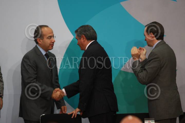 MÉXICO, D.F., 02DICIEMBRE2009.- Felipe Calderon Hinoijosa presidene de México saluda a Leonardo Valdes Zurita Consejero Presidente del Instituto Federal Electoral, en el salon Adolfo Lopez Mateos donde el mandatario mexicano realizó la clausura de la mesa redonda "La democracia de una encrucijada : el reto del financiamiento ilicito de la Politica" FOTO: SÁSHENKA GUTIÉRREZ/ CUARTOSCURO.COM