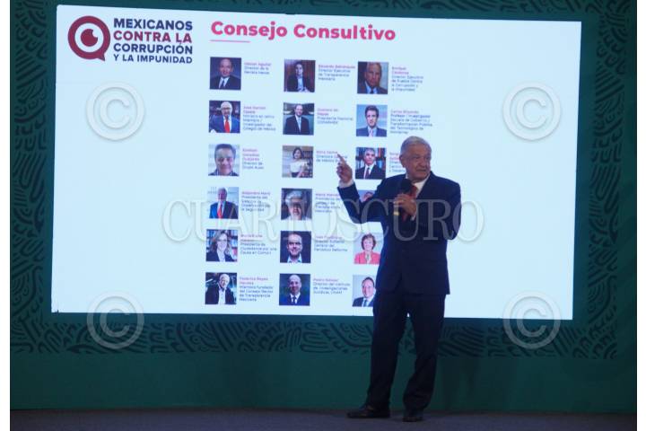 Andrés Manuel López Obrador, presidente de México muestra fotografía con algunos integrantes de la Asociación Mexicanos contra la corrupción y la impunidad