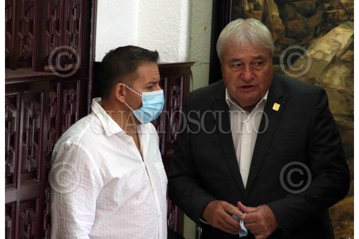 José Manuel Sanz Rivera, jefe de la Oficina de la Gobernatura y Alexander Piza coordinador de comunicación social durante el anuncio del programa de financiamiento al sector agropecuario para la temporada primavera-verano.