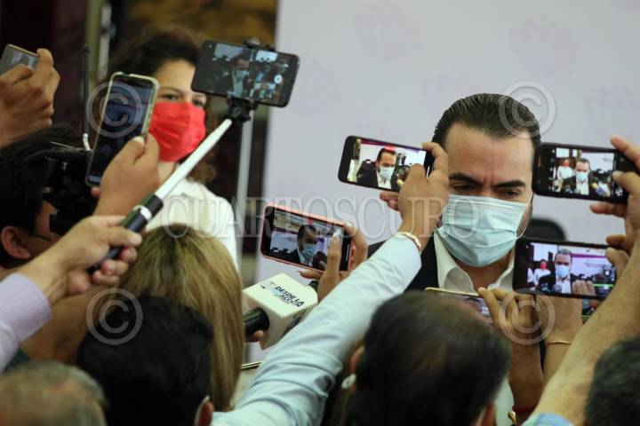 El secretario de Gobierno de Morelos, Pablo Ojeda, atiende a los medios de comunicación al final del anuncio del programa de financiamiento al sector agropecuario para la temporada primavera-verano.
