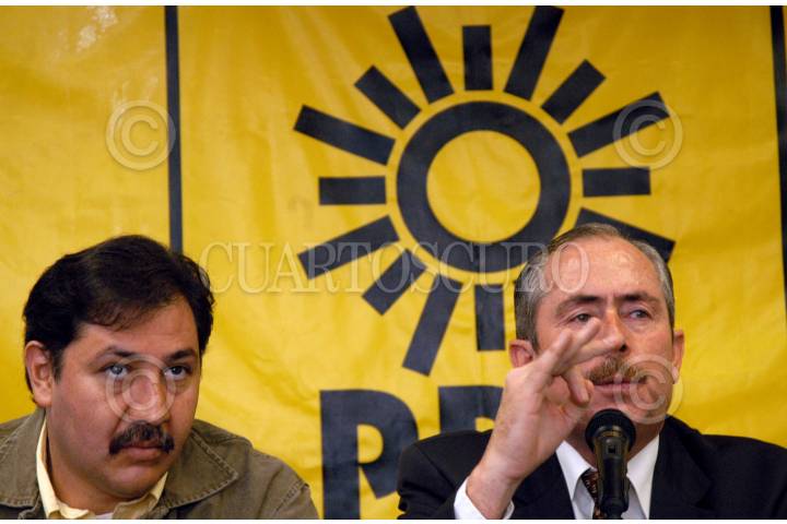 MEXICO, D.F. 02AGOSTO2005.- El vocero del CEN del PRD, Gerardo Fernández Noroña y el presidente nacional de ese partido Leonel Cota Montaño durante la conferencia de prensa donde denunciaron la falta del esclarecimiento de la procedencia de los recursos de las campañas que realizan precandidatos del PRI y del PAN. FOTO: Miguel Dimayuga/CUARTOSCURO.COM