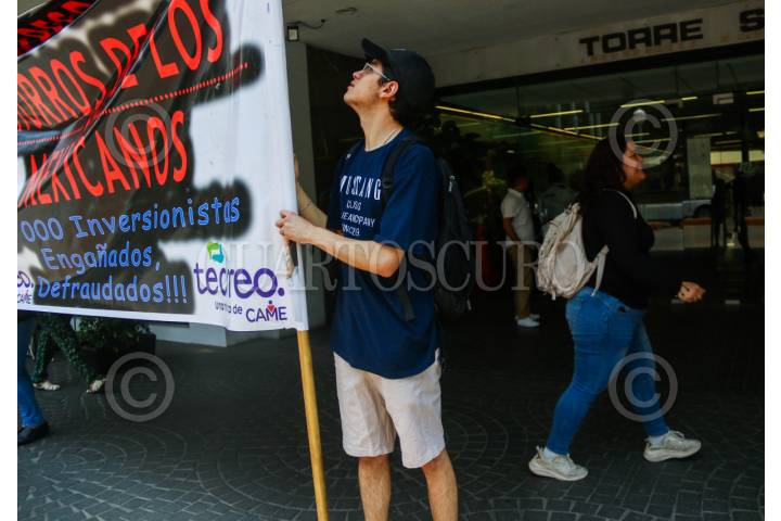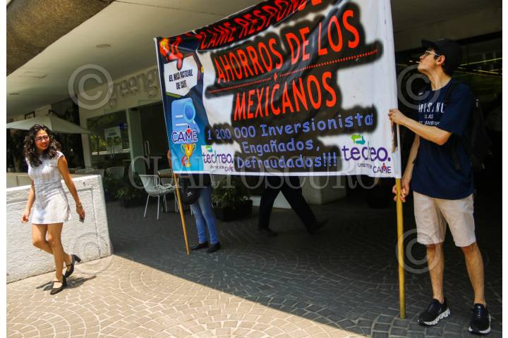 CIUDAD DE MÉXICO. 24ABRIL2925.- Un grupo de personas defraudadas por la empresa Consejo de Asistencia al Microemprendedor (Came), así como, algunos trabajadores, se manifestaron en las afueras de las oficinas de la Comisión Bancaria y de Valores, para denunciar una estafa a las de 1,2 de gente a nivel nacional. Denuncian que la CONDUSEF y el SAT se han negado a atenderlos. Denunciaron que desmontaron sus oficinas y bajaron la aplicación App. Exigieron la devolución de sus ahorros FOTO: VICTORIA VALTIERRA/CUARTOSCURO.COM