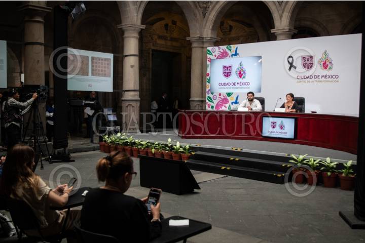 CIUDAD DE MÉXICO, 27MAYO2025.- Clara Brugada, jefa de gobierno de la Ciudad acompañada de Juan Pablo de Botton Falcón, secretario de administración y finanzas encabezaron conferencia de prensa en el antiguo Palacio de Ayuntamiento. FOTO: ANDREA MURCIA /CUARTOSCURO.COM