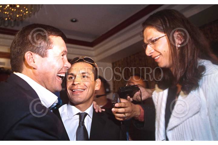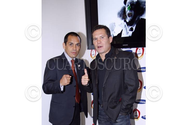 MÉXICO D.F., 28MARZO2008.- Ricardo Finito Lopéz y Julio Cesar Chavez posan a los fotógrafos en un hotel de la Ciudad de México durante el evento del encendido de la antorcha olímpica. FOTO: ALBERTO VERA/CUARTOSCURO.COM