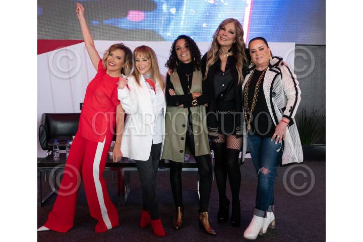 Mayte Lascurain (Pandora), Ilse (Flans), Fernanda Meade e Isabel Lascurain (Pandora) y Mimí (Flans) durante la conferencia de prensa previo a su presentación el próximo 23 de septiembre en la Arena Ciudad de México.