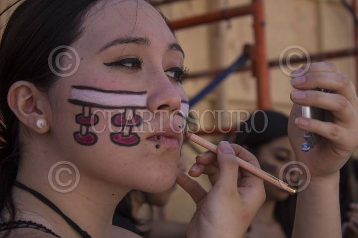 MEXICO, D.F., 06ABRIL2014.- Hoy se llevó a cabo la inauguración de la CCXXIX Fiesta de la Flor Más Bella del Ejido, en la delegación Xochimilco, en la cual participan jóvenes de distintas demarcaciones del Distrito Federal, quienes contienden por ser declaradas la flor que da nombre a esta tradicional fiesta. Los orígenes de esta fiesta se remontan 229 años atrás, debido a la intención de los campesinos de resaltar la belleza de las mujeres que habitaban los ejidos de la Ciudad de México, de los cuales aún sobreviven algunas zonas. En el marco de la celebración se presentaron distintas actividades y bailes tradicionales y folklóricos. En la imagen, una joven se maquilla antes de presentarse con un baile prehispánico, en la explanada delegacional de Xochimilco. FOTO: DAVID POLO /CUARTOSCURO.COM