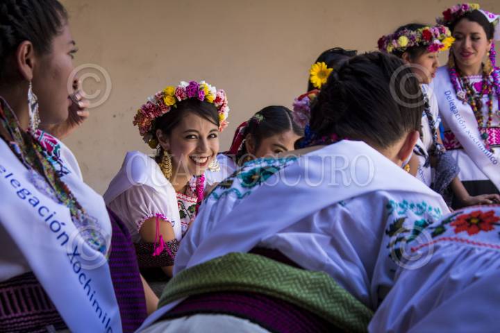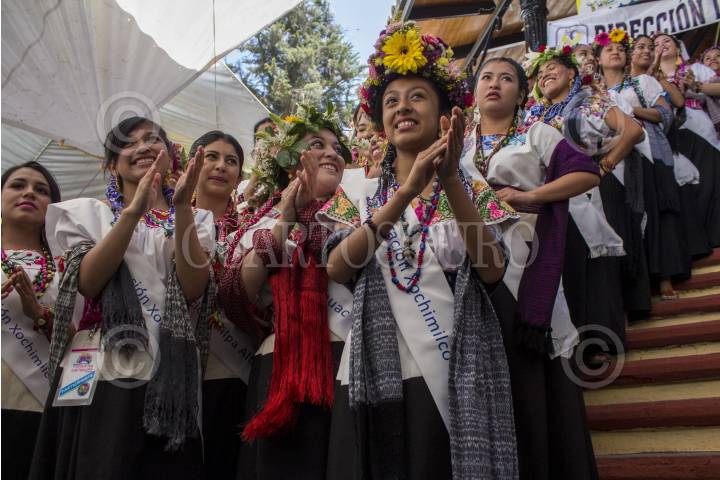 MEXICO, D.F., 06ABRIL2014.- Hoy se llevó a cabo la inauguración de la CCXXIX Fiesta de la Flor Más Bella del Ejido, en la delegación Xochimilco, en la cual participan jóvenes de distintas demarcaciones del Distrito Federal, quienes contienden por ser declaradas la flor que da nombre a esta tradicional fiesta. Los orígenes de esta fiesta se remontan 229 años atrás, debido a la intención de los campesinos de resaltar la belleza de las mujeres que habitaban los ejidos de la Ciudad de México, de los cuales aún sobreviven algunas zonas. En el marco de la celebración se presentaron distintas actividades y bailes tradicionales y folklóricos. En la imagen, las concursantes que este año concursan por ser las Flor más Bella del Ejido. FOTO: DAVID POLO /CUARTOSCURO.COM