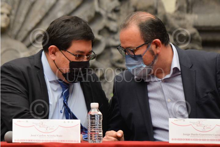José Carlos Acosta Ruíz, alcalde de Xochimilco, y Jorge Darío Guerrero, director general de Servicios al Turismo capitalino, durante la presentación de la Fiesta de la Flor más Bella del Ejido la cual regresará tras dos años de no realizarse derivado de la pandemia por covid-19.
