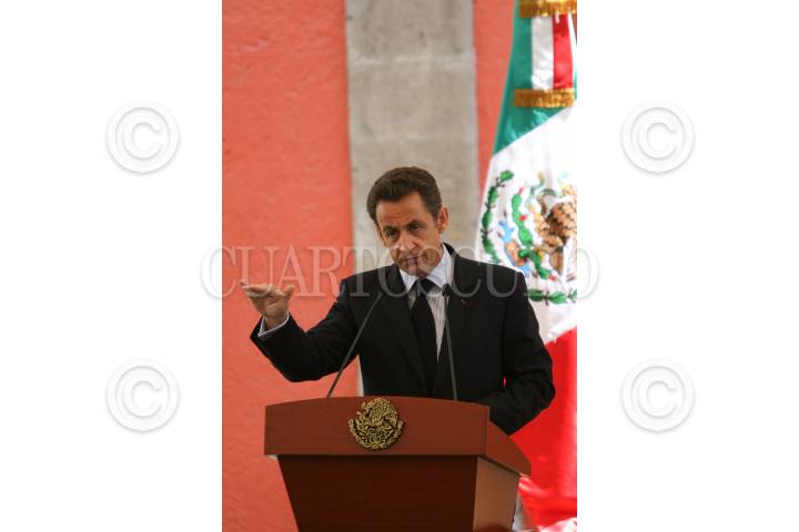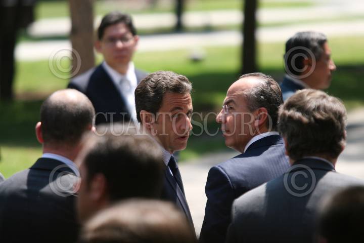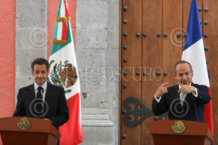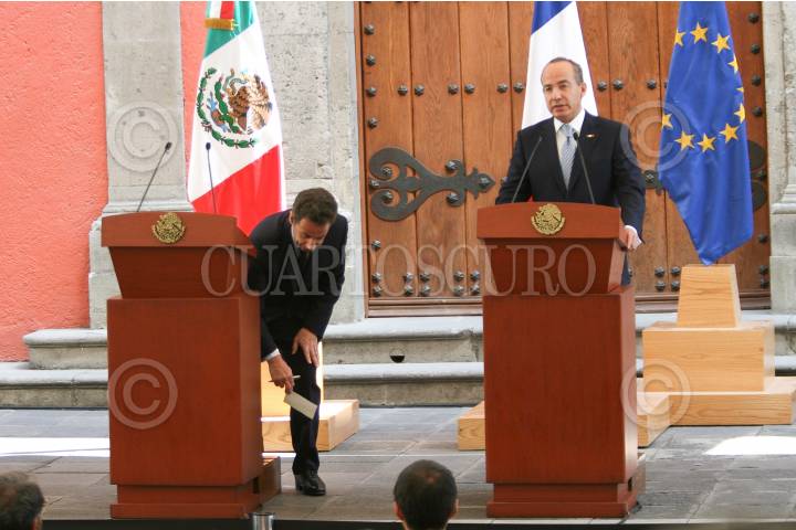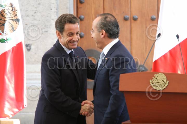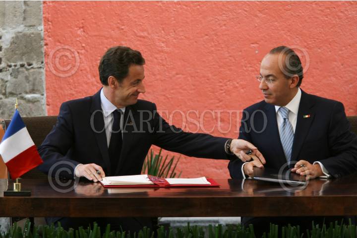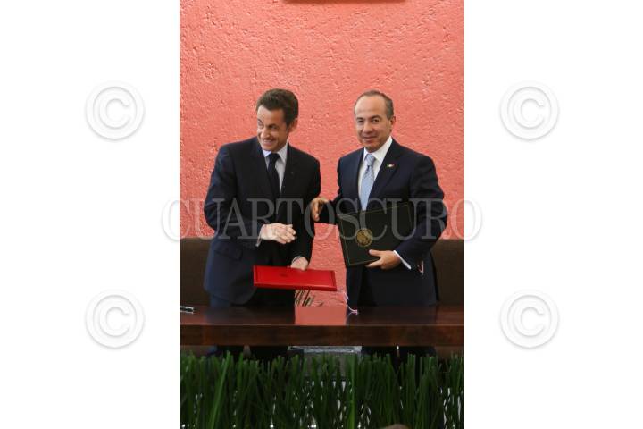 MÉXICO D.F., 09MARZO2009.- Felipe Calderón Hinojosa, Presidente de México, acompañado de Nicolás Sarkozy, Presidente de la República de Francia, durante la firma del convenio de para la creación de una comisión bilateral que revisará una posible extradición de la francesa Florence Cassez, acusada de secuestro en México. FOTO: GUILLERMO PEREA/CUARTOSCURO.COM