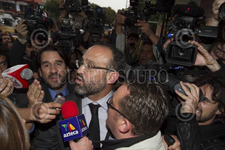 MÉXICO, D.F., 23ENERO2013.- Los abogados de la ciudadana francesa Florence Cassez; Frank Berton y Agustín Acosta, salen de Centro Femenil de Readaptación Social. La Suprema Corte de Justicia de la Nación deliberó otorgarle un amparo liso y llano a Cassez, quien estaba condenada a más de 60 años de prisión por el delito de secuestro. Los defensores fueron increpados por los familiares de las víctimas de secuestro de la banda de los Zodiacos cuyo líder era la pareja sentimental de Florence Cassez. FOTO: GUILLERMO PEREA /CUARTOSCURO.COM