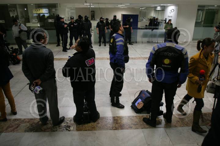 MÉXICO, D.F. 23ENERO2013.-Custodiado por policias federales el Instituto Nacional de Migración (INMI), en el Aereopuerto Internacional de la Ciudad de México, nunca recibió la visita de la recién liberada Florence Cassez, pues la misma policia que la arrestó esta vez la cubrió de los medios de comunicación en todo momento pasandola por otra puerta. FOTO: JUAN PABLO ZAMORA /CUARTOSCURO.COM