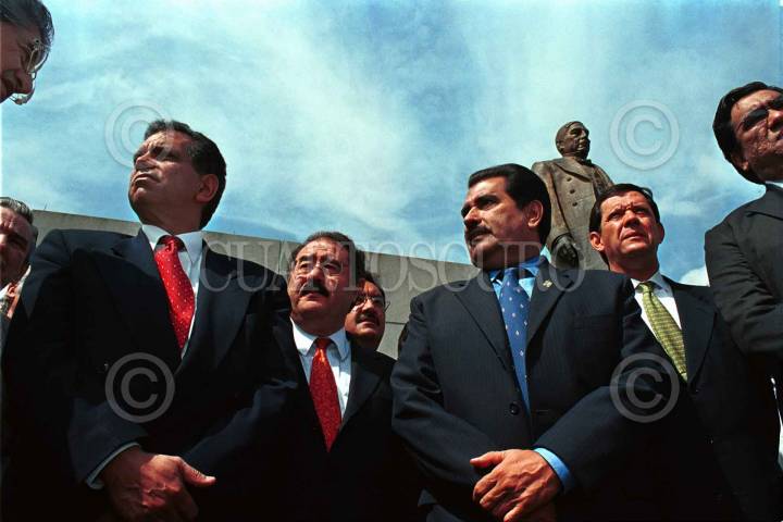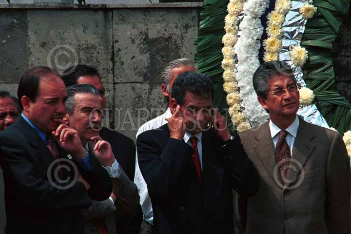 Un grupo priístas, encabezados por Cesar Augusto Santiago, Fidel Herrera Beltrán, Manuel Jiménez Guzmán, Florentino Castro y Roberto Campa, entre otros, colocaron una ofrenda en la estatua de Benito Juárez, en la explanda del IFE, donde exigieron al IFE información precisa sobre el financiamiento a la campaña de Vicente Fox. FOTO: Sandra Perdomo/CUARTOSCURO.COM
