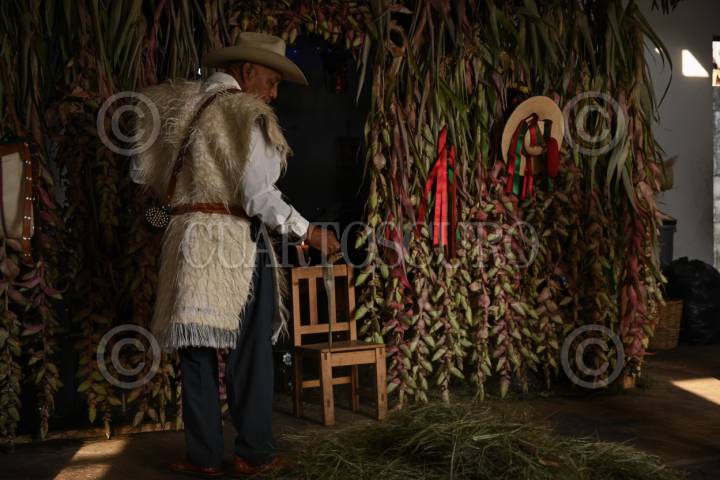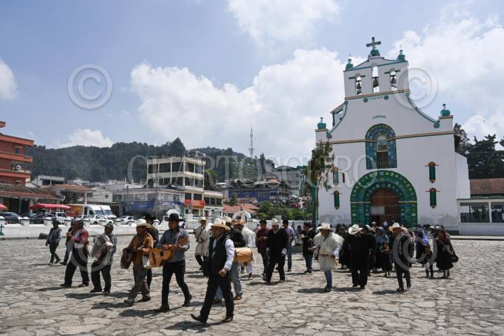 SAN JUAN CHAMULA, CHIAPAS, 23MAYO2025.- En la casa del Paxon del barrio de San Sebastián, las autoridades tradicionales llevan a cabo, en comunidad, el cambio de ornamenta de los altares como parte de los preparativos para una de las fiestas más importantes del pueblo tsotsil de San Juan. Durante esta ceremonia, las y los principales rezan, renuevan los altares, comparten el pox y, al compás de guitarras, arpas y tambores, danzan y entonan oraciones en su lengua materna, el tsotsil. FOTO: ISABEL MATEOS HINOJOSA /CUARTOSCURO.COM