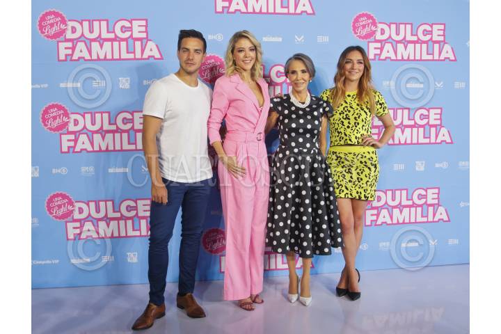 CIUDAD DE MÉXICO, 02MAYO2019.- El elenco de la película "Dulce Familia", integrado por Vadhir Derbez, Fernanda Castillo, Florinda Meza y Regina Blandón, posan para los fotógrafos durante la presentación del filme. FOTO: ISAAC ESQUIVEL /CUARTOSCURO.COM