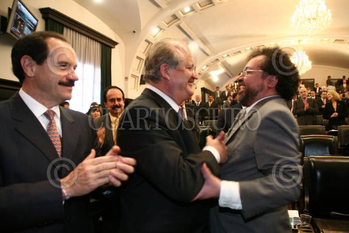 MÉXICO, D.F., 17MARZO2009.- René Arce y Graco Ramírez, senadores del PRD, felicitan al nuevo consejero de Pemex, Flavio César Ruíz Alarcón. FOTO: CUARTOSCURO.COM