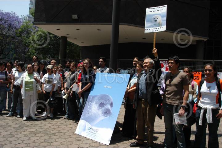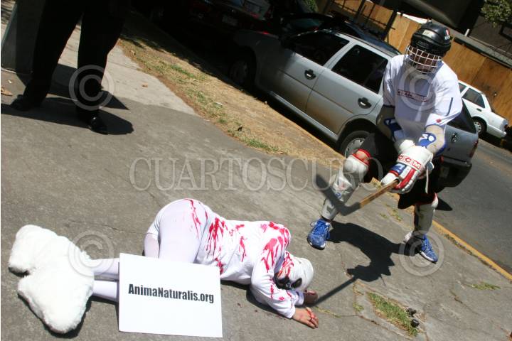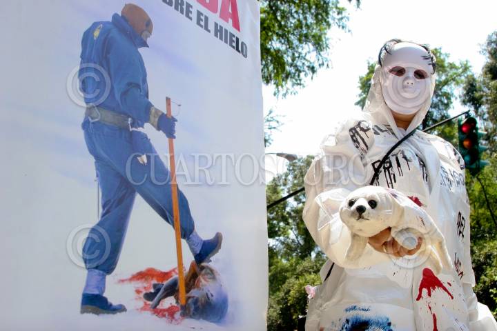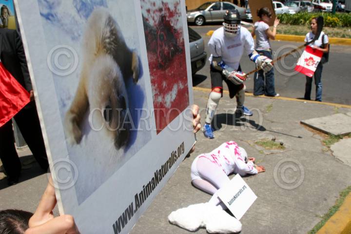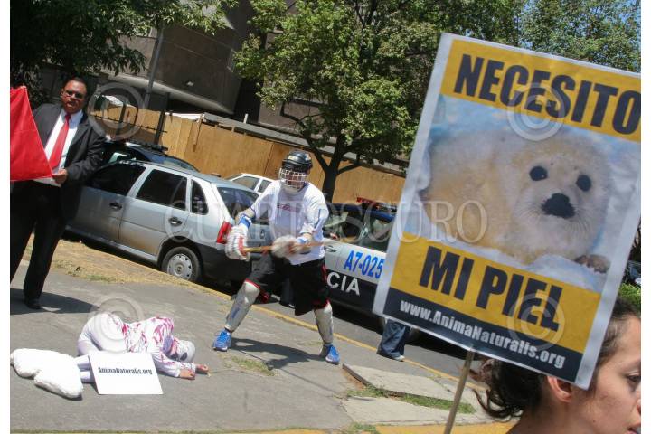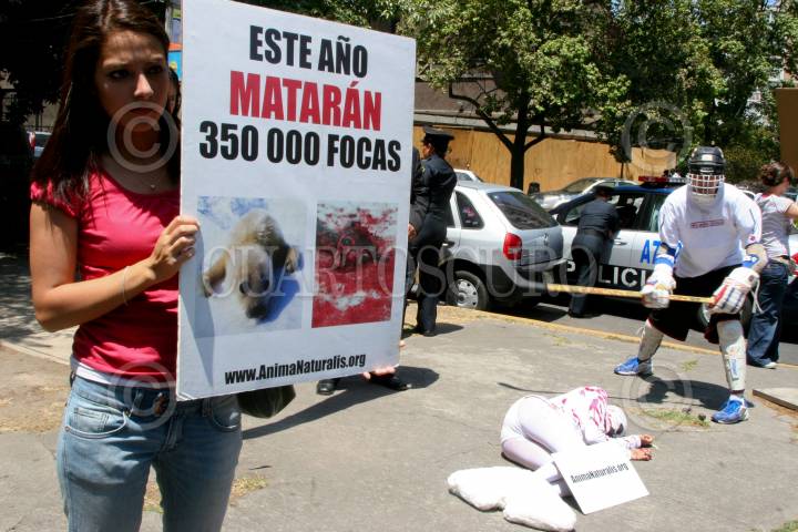 MÉXICO, D.F., 26MARZO2009.- Miembros de AnimaNaturalis, se protestaron a las afueras de la embajada de Canadá, esto para manifestase en contra de la caza masiva de focas que se realiza en este pais, en el mismo evento anunciaron que lanzaran una campaña internacional masiva para boicotear los juegos olímpicos de invierno que se realizaran en Vancouver en el 2010 si es que el gobierno canadiese continua con esta caza sanguinaria de focas. FOTO: RICARDO CASTELAN/CUARTOSCURO.COM