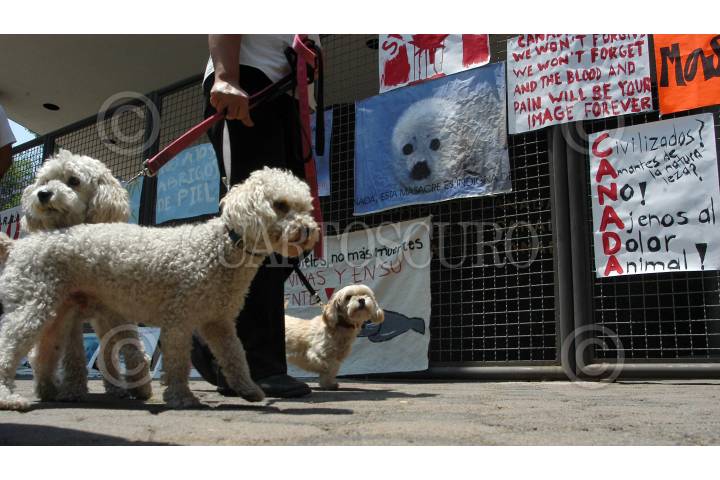MEXICO D.F. 06ABRIL2006.- Decenas integrantes de organizaciones ecologistas y defensoras de derechos de animales realizaron una manifestación contra la matanza de focas frente a la embajada de Canada. Un grupo de perros caminan frente a los carteles de protesta. FOTO: Germán Romero/CUARTOSCURO.COM
