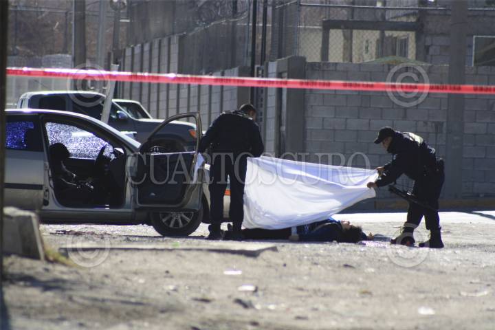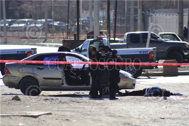 CIUDAD JUÁREZ, CHIHUAHUA, 30ENERO2012.- Sujetos armados privaron de la vida a un hombre y una mujer en las calles de un parque industrial muriendo los hoy occisos en el interior del vehículo. El hombre y la mujer quedó tirada en el suelo al lado del automóvil Ford Focus. El hecho violento se registró cuando una de las víctimas conducía un vehículo Focus dorado, el cual fue interceptado por un grupo de gatilleros quienes les realizaron varios disparos hasta dejar a la pareja sin vida en la calle Fernando Borreguero para luego huir del lugar. FOTO: NACHO RUIZ/CUARTOSCURO.COM
