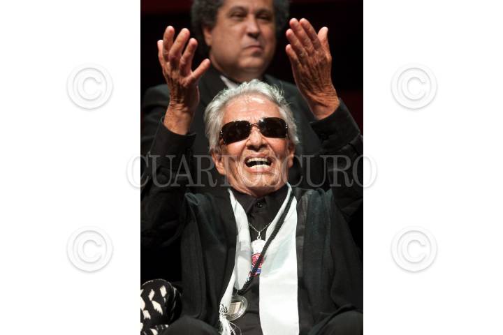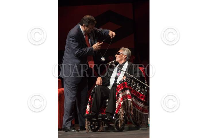 MÉXICO, D.F., 21ABRIL2009.- Chavela Vargas recibió de manos de Marcelo Ebrard, jefe de Gobierno del Distrito Federal, la Medalla al Mérito, durante el homenaje que se le rindió a la cantante en el teatro de Ciudad de México, en celebración por sus 90 años de vida. FOTO: ISAAC ESQUIVEL/CUARTOSCURO.COM