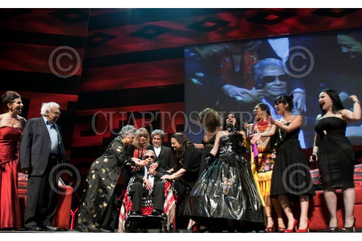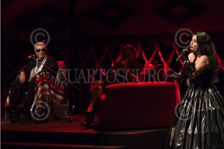 MÉXICO, D.F., 21ABRIL2009.- La cantante Chavela Vargas fue homenajeada en el teatro de Ciudad de México, en celebración por sus 90 años de vida. Durante el espectáculo que duró poco más de hora y media, participaron Carlos Monsiváis, Eugenia León, Astrid Hadad, Lila Downs, Julieta Venegas y Alaska, entre otros. FOTO: ISAAC ESQUIVEL/CUARTOSCURO.COM