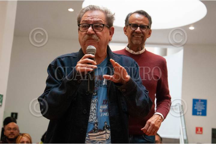 CIUDAD DE MÉXICO, 22ENERO2024.- Paco Ignacio Taibo II, director general del Fondo de Cultura Económica y Javier Hidalgo, coordinador general del Subsistema de Educación Comunitaria PILARES, ofrecen n mensaje a los miembros de PILARES que se dieron cita en la librería para recibir los textos. FOTO: DANIEL AUGUSTO /CUARTOSCURO.COM