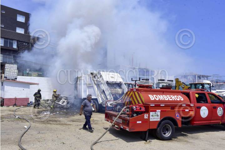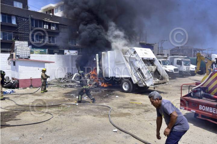 ACAPULCO, GUERRERO, 11MAYO2025.- Un camión recolector de basura de Fondo Nacional de Fomento al Turismo (FONATUR) se incendió por un corto circuito mientras recibía mantenimiento dentro de un estacionamiento en la avenida Cuauhtémoc de Acapulco, durante el incidente una persona resultó con quemaduras y fue trasladada a un hospital para recibir atención médica, el fuego fue controlado por bomberos de Protección Civil de Acapulco. FOTO: CARLOS ALBERTO CARBAJAL/CUARTOSCURO.COM