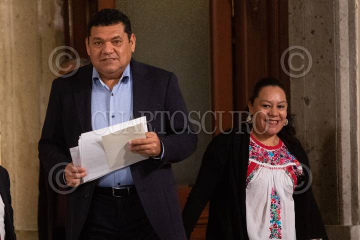 Javier May de Fonatur y Diego Prieto del INAH conversan durante la mañanera.