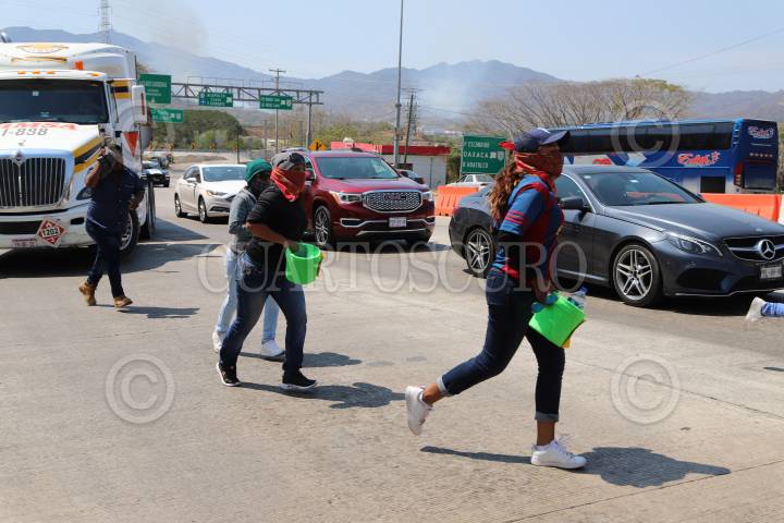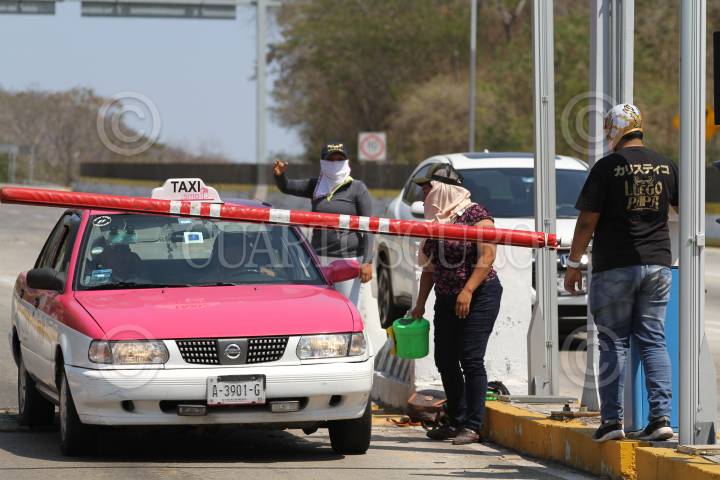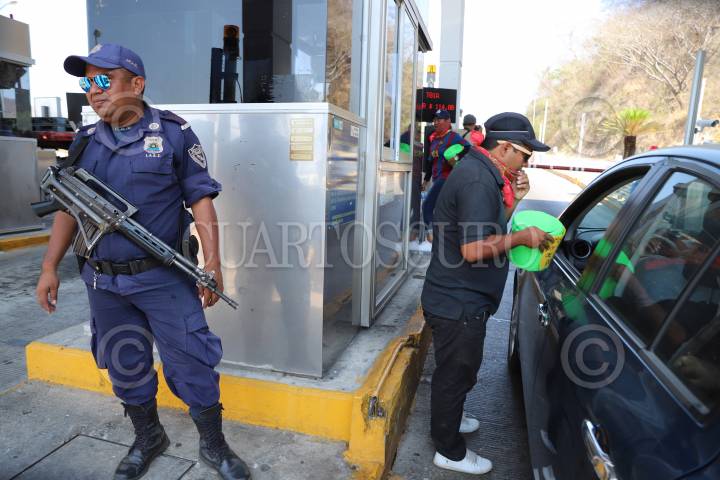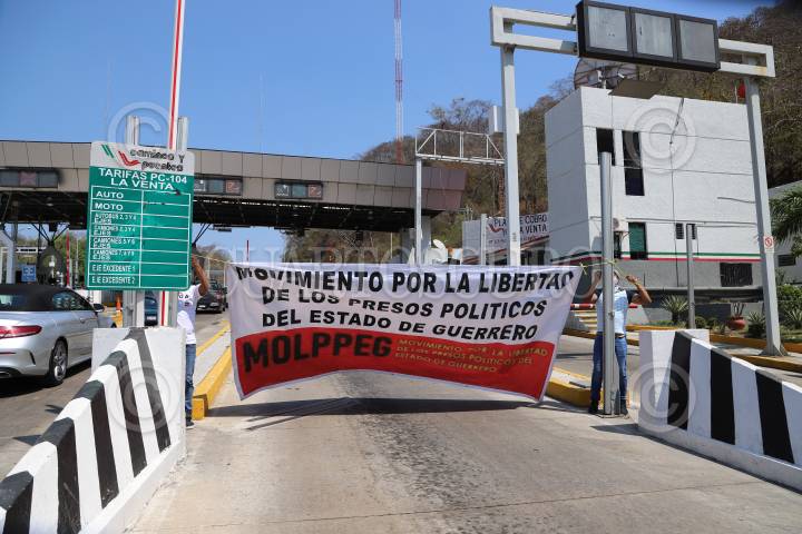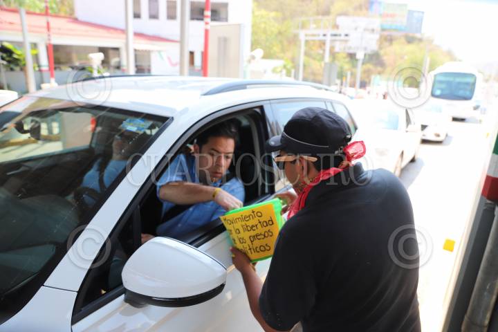 ACAPULCO, GUERRERO, 25FEBRERO2019.- Integrantes del Movimiento por la Libertad de los Presos Políticos del Estado de Guerrero tomaron la caseta de peaje de la venta de la Autopista del Sol, donde pidieron cooperación a los automovilistas, esto con el argumento de que dos miembros del Consejo de Ejidos y Comunidades Opositoras a la Presa La Parota, fueron liberados, pero se les fue fijada una fianza muy alta, por lo que requieren de recabar fondos para lograr su liberación. FOTO: BERNANDINO HERNÁNDEZ /CUARTOSCURO.COM