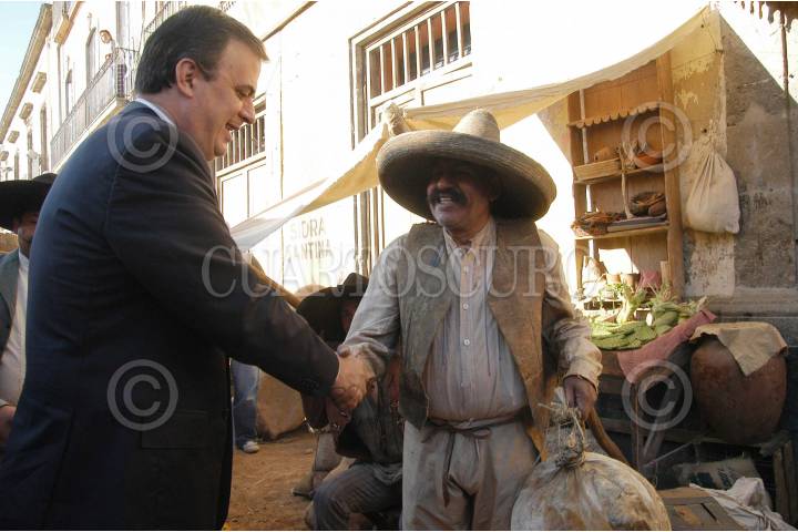 MÉXICO, D.F., 23NOVIEMBRE2009.- Marcelo Ebrard Casaubón, jefe de gobierno del D.F., saluda a un actor en el pizarrazo de inicio de filmación de la pelicula El Atentado, protagonizada por Daniel Gimenez Cacho, Diego Luna y Jose Maria Yazpik, bajo la dirección de Jorge Fons en una producción de basada en la Novela de El Expediente del Atentado de Alvaro Uribe, en la calle de Roldan, centro histórico. En la imagen aspectos del rodaje. FOTO: CUARTOSCURO.COM