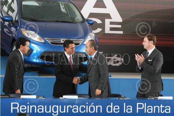 CUAUTITLAN ESTADO DE MÉXICO. 11MAYO2010.- Felipe Calderón Hinojosa, Presidente de México, acompaña de Gerardo Ruiz Mateos, Secretario de Economía, Enrique Peña Nieto, gobernador de esta entidad, Jim Farley, Vicepresidente de Mercadotecnia Global y de Operaciones de Norteamérica y Sudamérica de Ford Motor Company, encabezo la reinauguración de la planta Ford Cuautitlan, y el lanzamiento del Ford Fiesta 2011. FOTO: GUILLERMO PEREA/CUARTOSCURO.COM