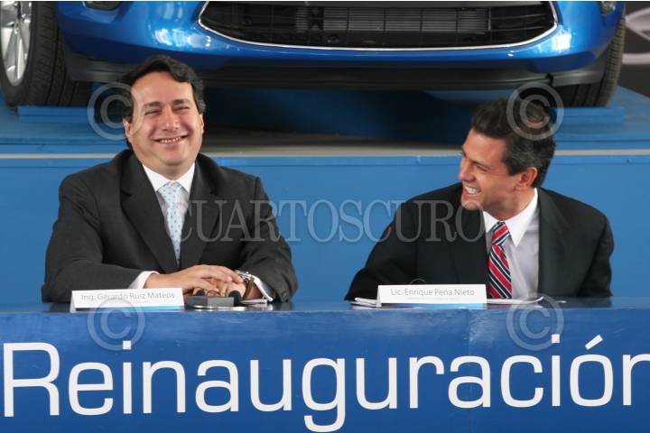 CUAUTITLAN ESTADO DE MÉXICO. 11MAYO2010.- Gerardo Ruiz Mateos, Secretario de Economía, Enrique Peña Nieto, gobernador de esta entidad, durante la reinauguración de la planta Ford Cuautitlan, y el lanzamiento del Ford Fiesta 2011. FOTO: GUILLERMO PEREA/CUARTOSCURO.COM
