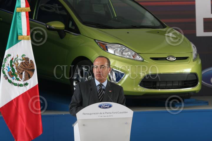 CUAUTITLAN ESTADO DE MÉXICO. 11MAYO2010.- Felipe Calderón Hinojosa, Presidente de México, durante la reinauguración de la planta Ford Cuautitlan, y el lanzamiento del Ford Fiesta 2011. FOTO: GUILLERMO PEREA/CUARTOSCURO.COM