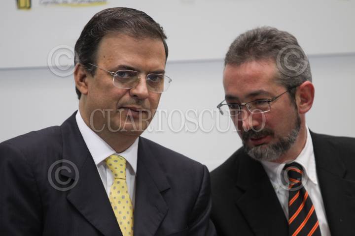 MÉXICO, D.F., 27JULIO2010.- Marcelo Ebrard Casaubón, Jefe de Gobierno, conversa con Oscar Guerra Ford, comisionado presidente del info-DF, durante la ceremonia en la que se presentó el "Portal Ciudadano de la Línea 12 del Metro", esto en el Palacio del Ayuntamiento. FOTO: MOISÉS PABLO/CUARTOSCURO.COM